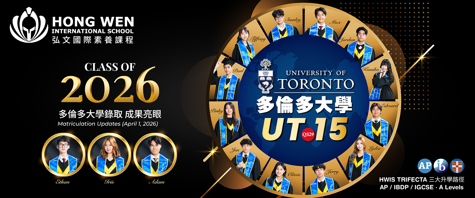 專為七至十二年級學生打造的弘文國際素養課程,除提供國際文憑大學預科課程(IBDP),更開設三十六門大學先修課程(AP)。我們著重培養批判思維、全球視野與卓越學術力,幫助學生進入世界頂尖大學,並在國際舞台上脫穎而出。